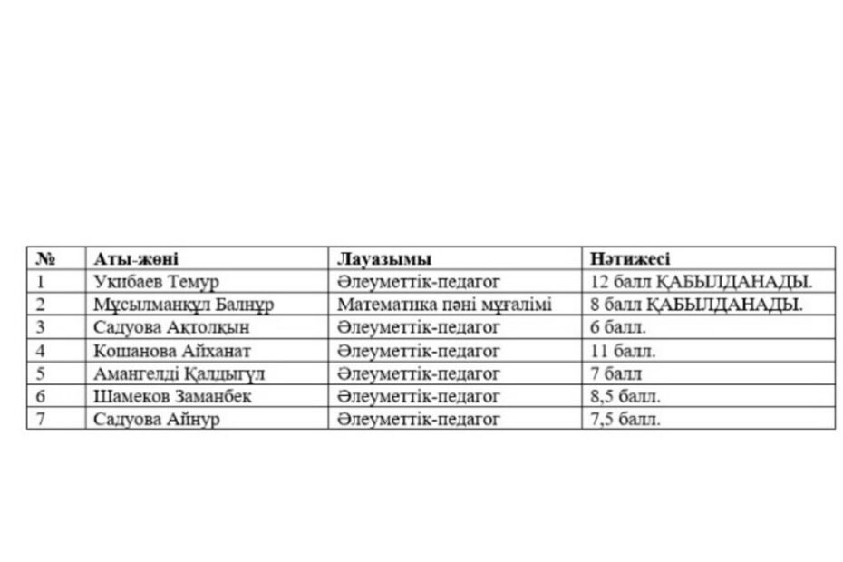 “Мемлекеттік білім беру ұйымдарының бірінші басшылары мен педагогтерін лауазымға тағайындау, лауазымнан босату қағидаларын бекіту туралы” ҚР БжҒМ 2012 жылғы 21 ақпандағы №57 бұйрығына өзгерістер енгізу туралы ҚР Оқу-ағарту министрінің 2023 жылғы 15 тамыздағы №259 және ҚР Премьер-Министрінің орынбасары Еңбек және халықты әлеуметтік қорғау министрінің 2023 жылғы 16 тамыздағы №343 бірлескен бұйрығын негізге ала отырып, конкурсқа қатысушылардың арасынан кестеде көрсетілген педагогтар арнайы талаптар бойынша жұмысқа қабылданды.